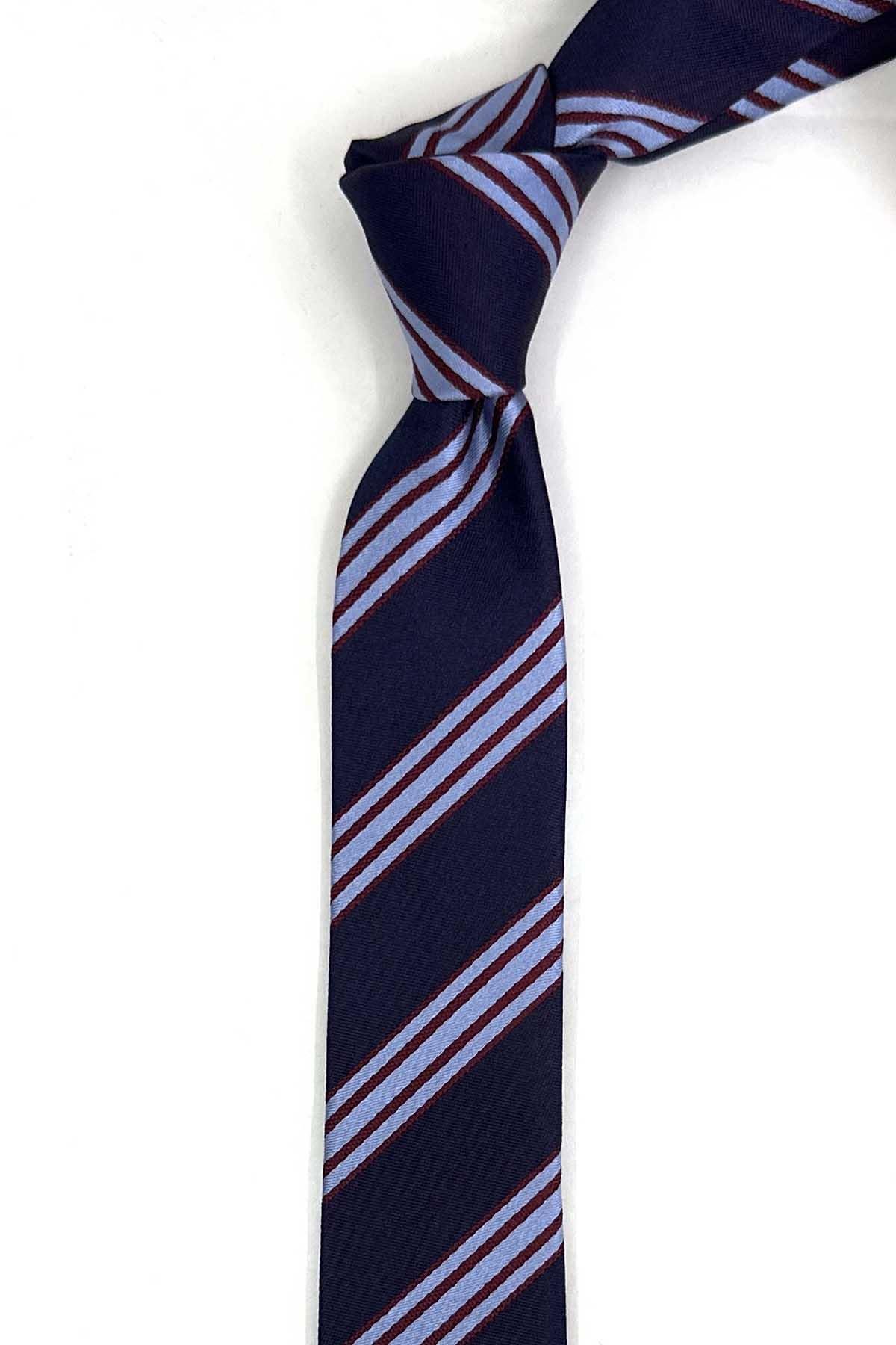4.7 cm Bordo Mavi Çizgi Desen Ultra Slim İpek Kravat İK2338 (İK2338)