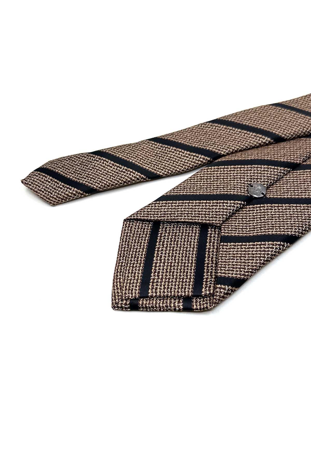 Bej - Siyah Çizgi Desen Mendilli Klasik Kravat KK13503 (KK13503)