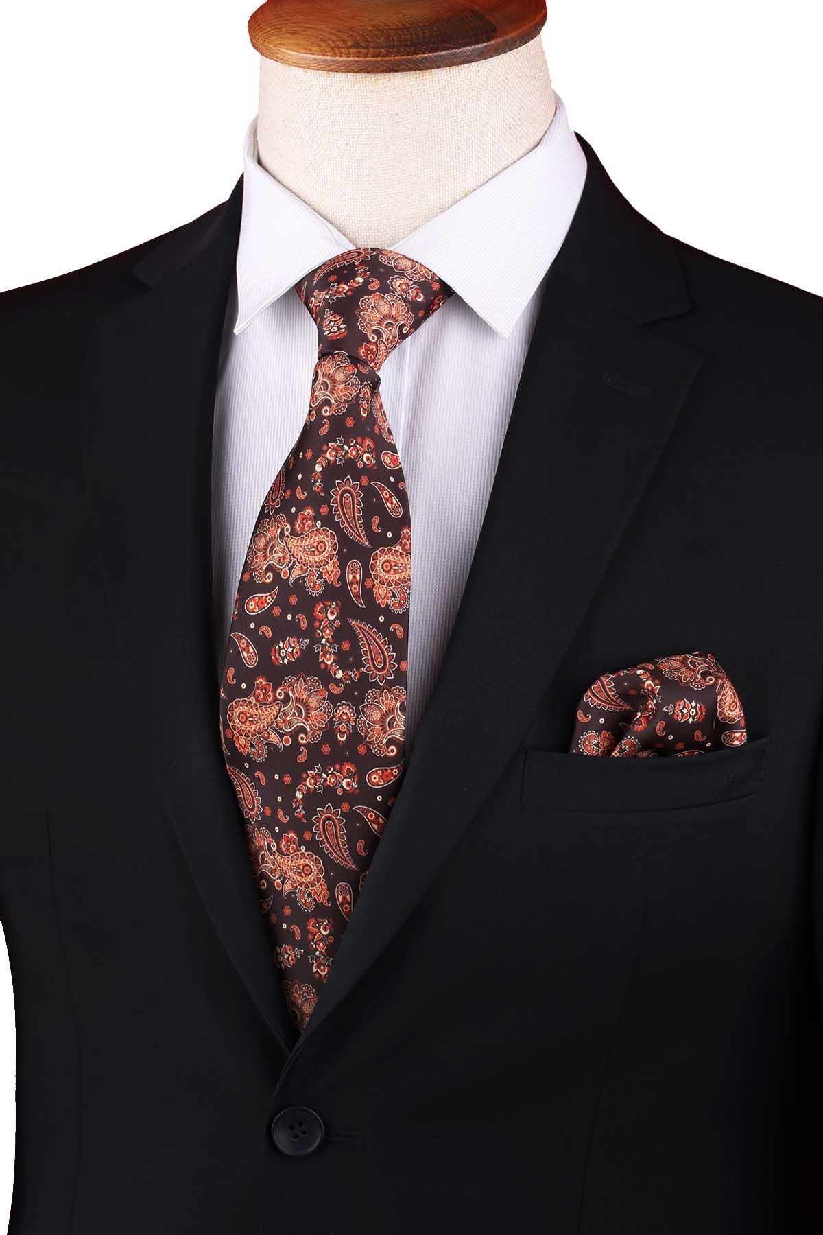 Kahve Şal Desen Baskılı Mendilli Klasik Kravat KK13353 (KK13353)