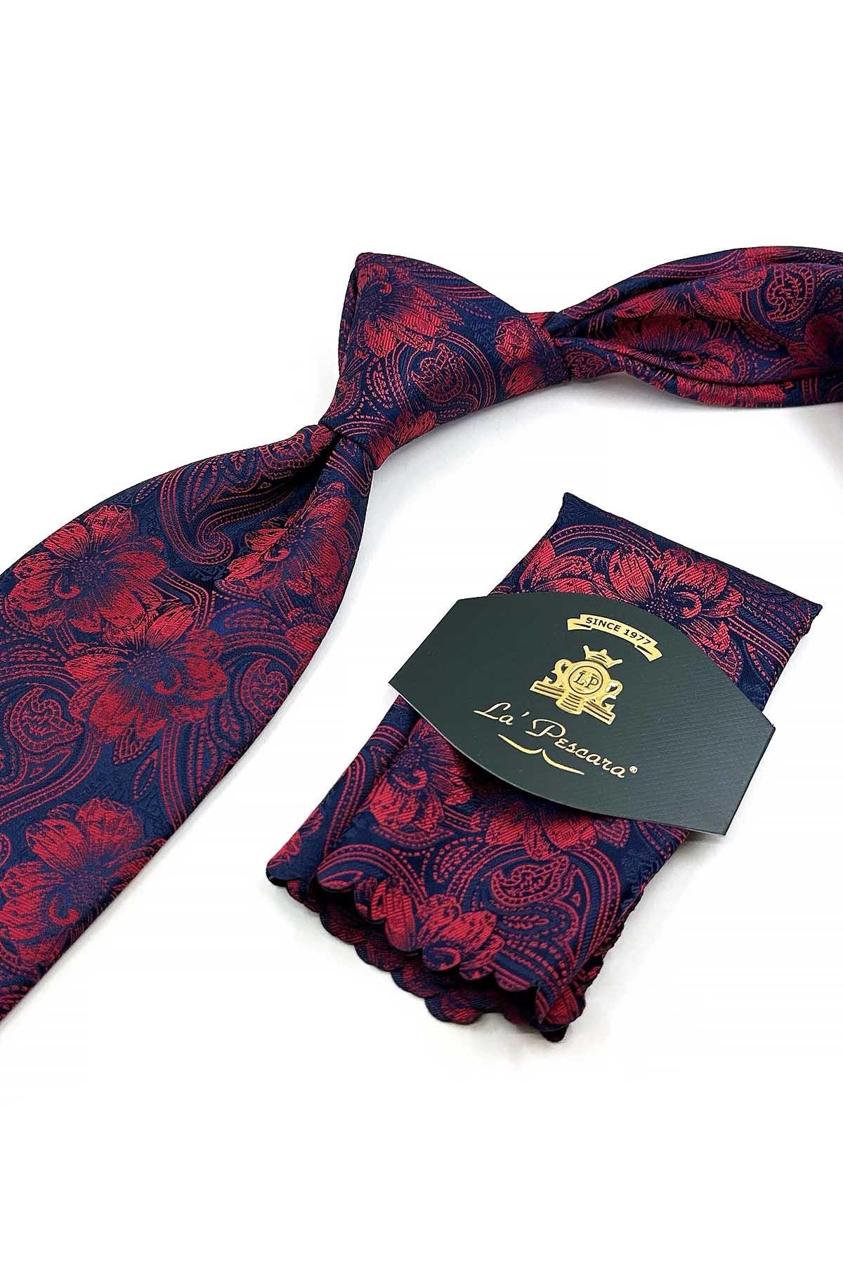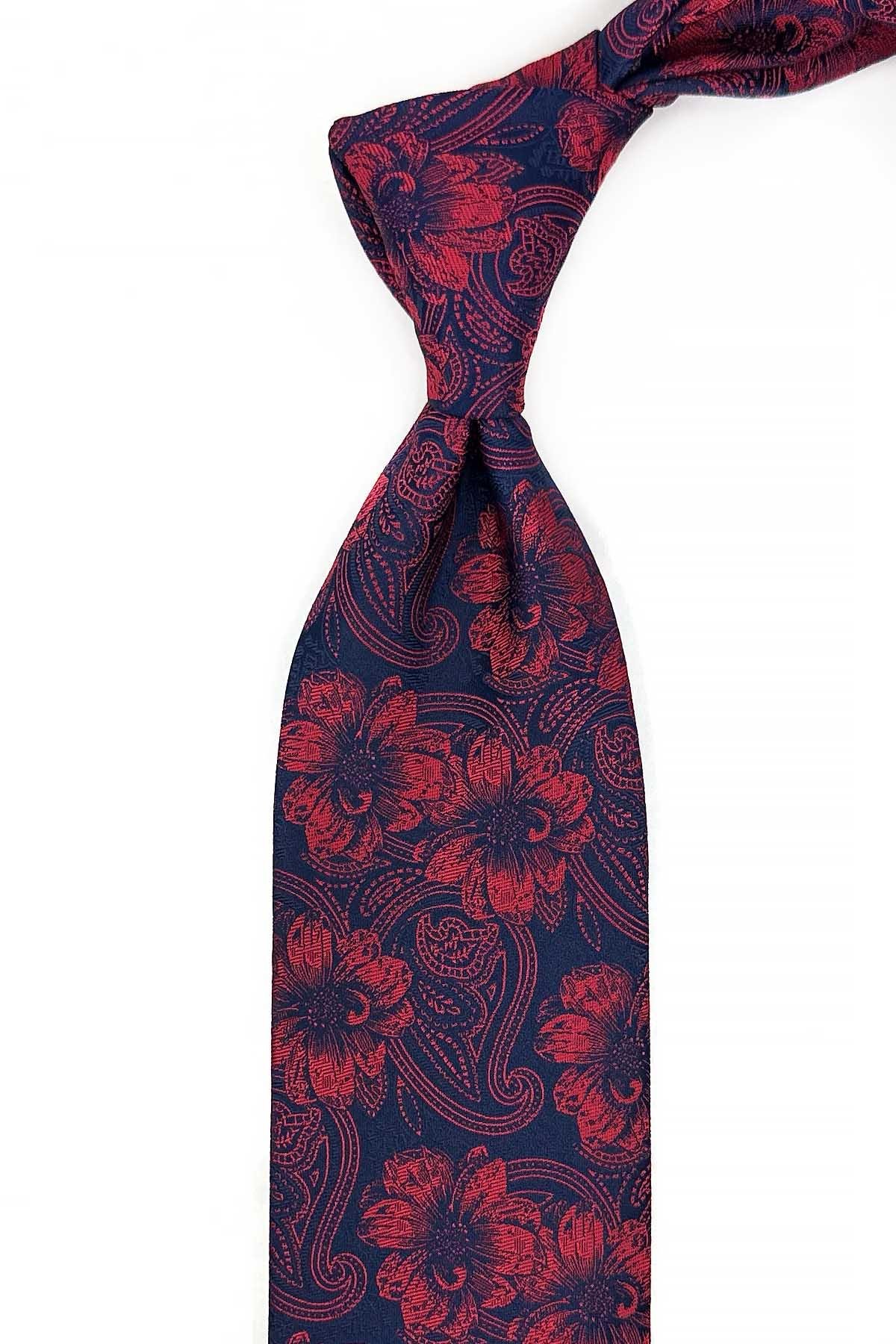 Kırmızı - Lacivert Çiçek Desen Mendilli Klasik Kravat KK12946 (KK12946)