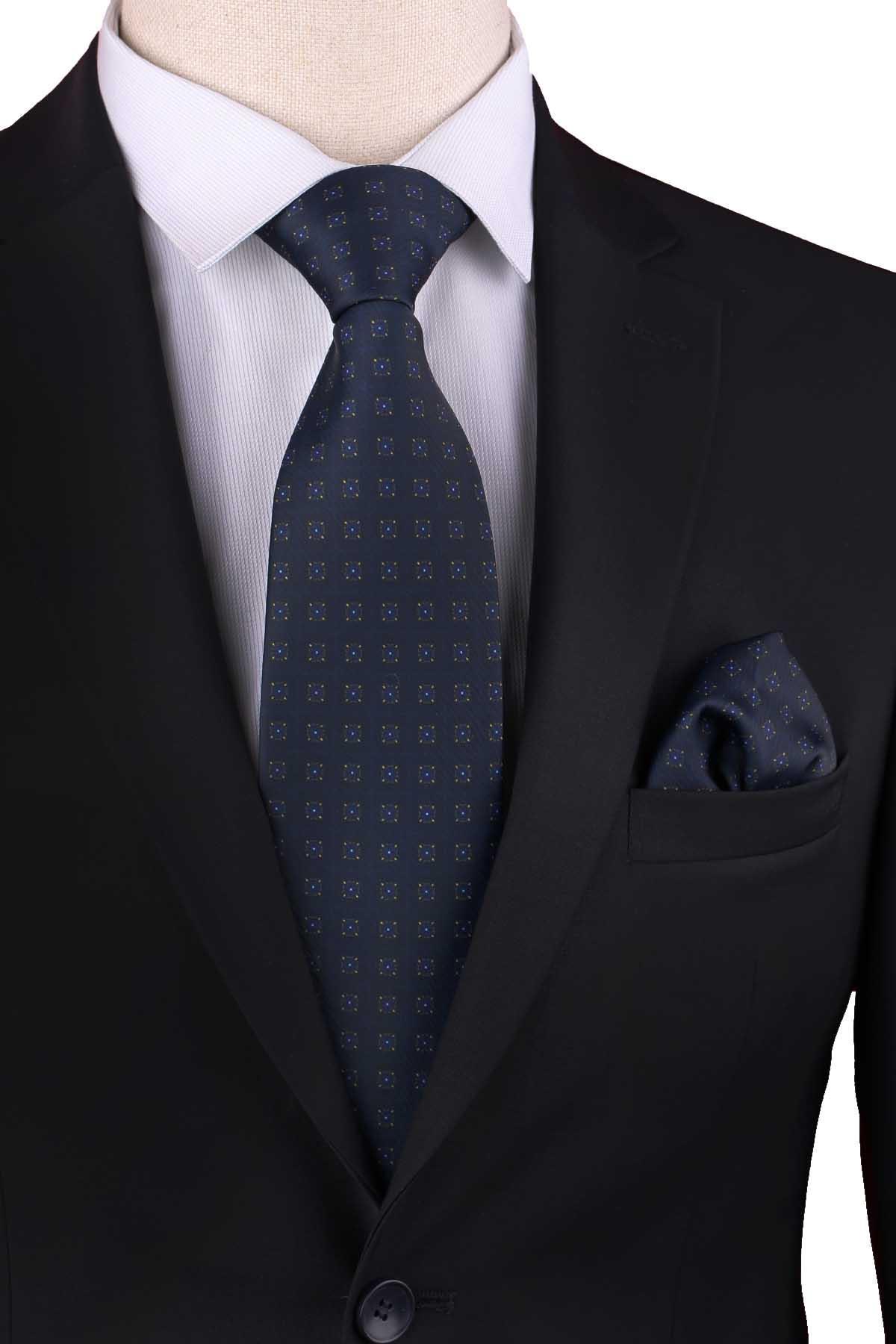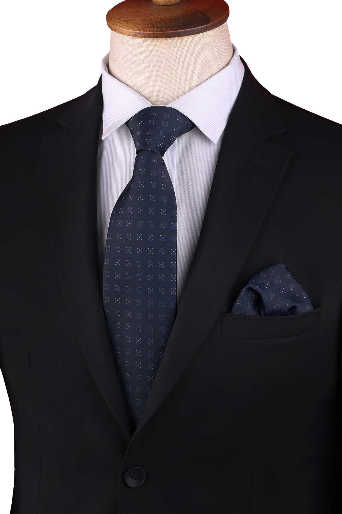 Lacivert Küçük Desen Baskılı Mendilli Klasik Kravat KK13347 (KK13347)