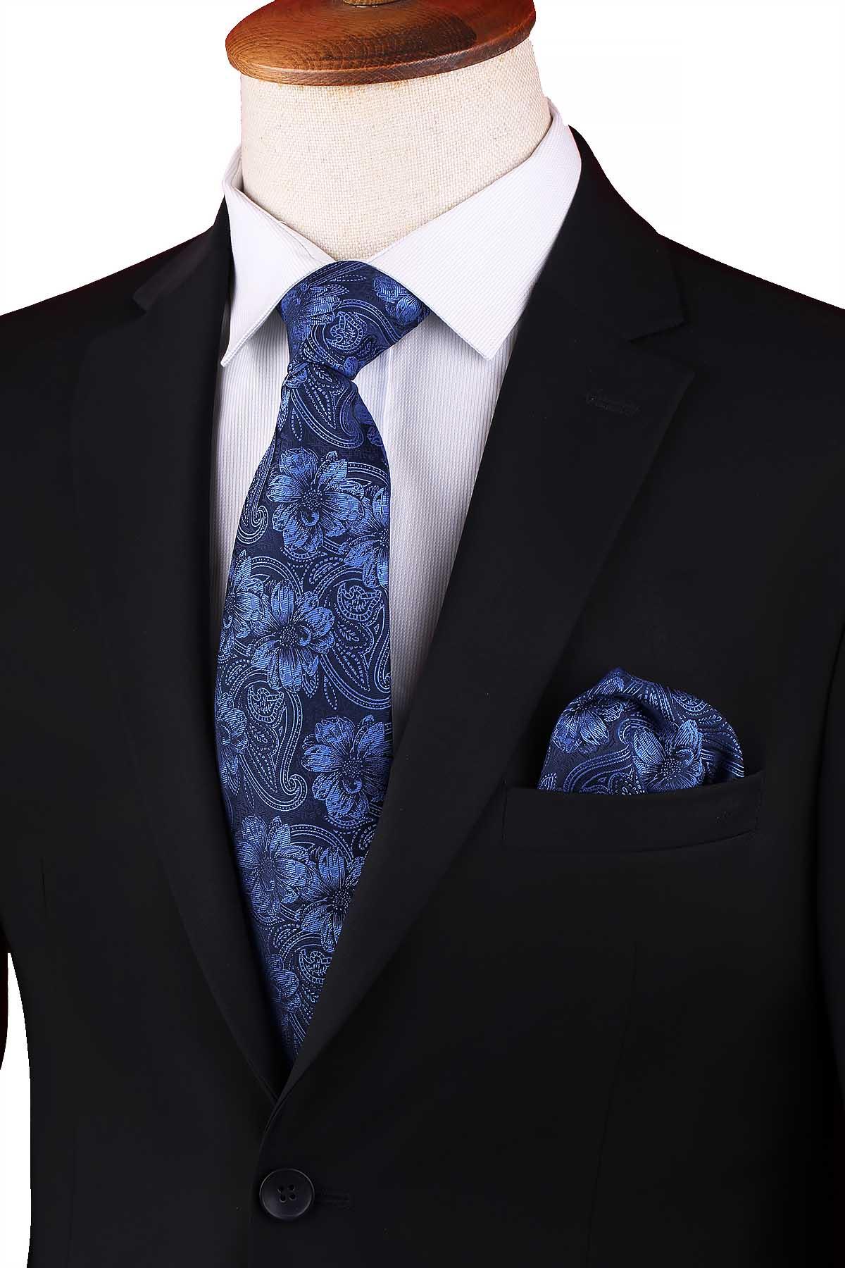 Lacivert - Mavi Çiçek Desen Mendilli Klasik Kravat KK12945 (KK12945)