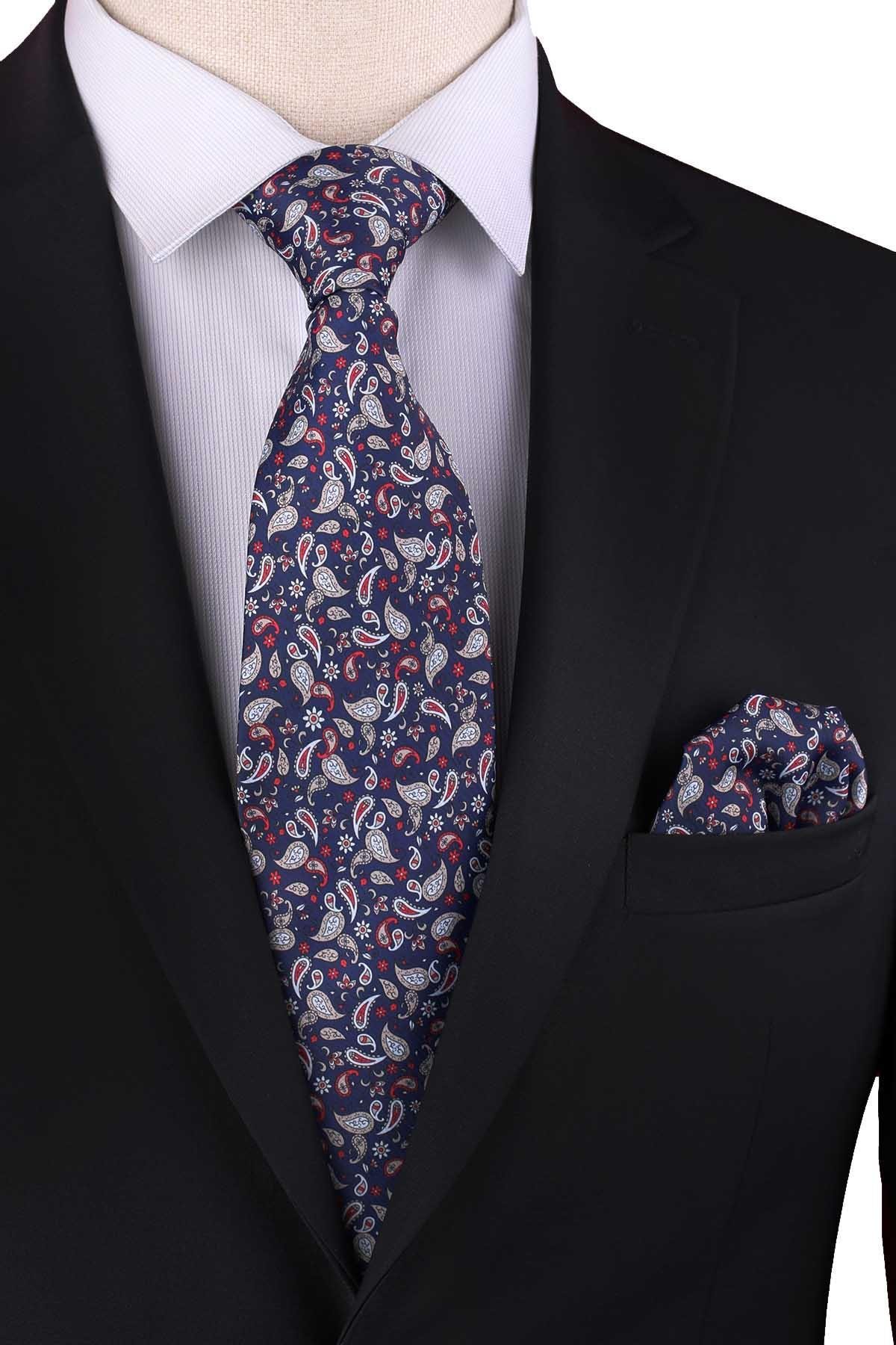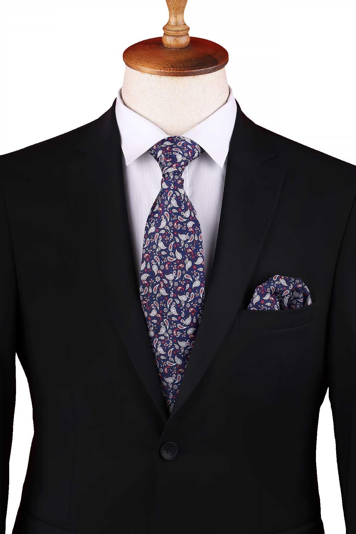 Lacivert Şal Desen Baskılı Mendilli Klasik Kravat KK13343 (KK13343)