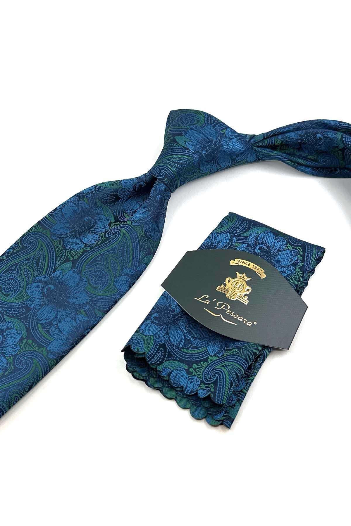 Lacivert - Yeşil Çiçek Desen Mendilli Klasik Kravat KK13336 (KK13336)