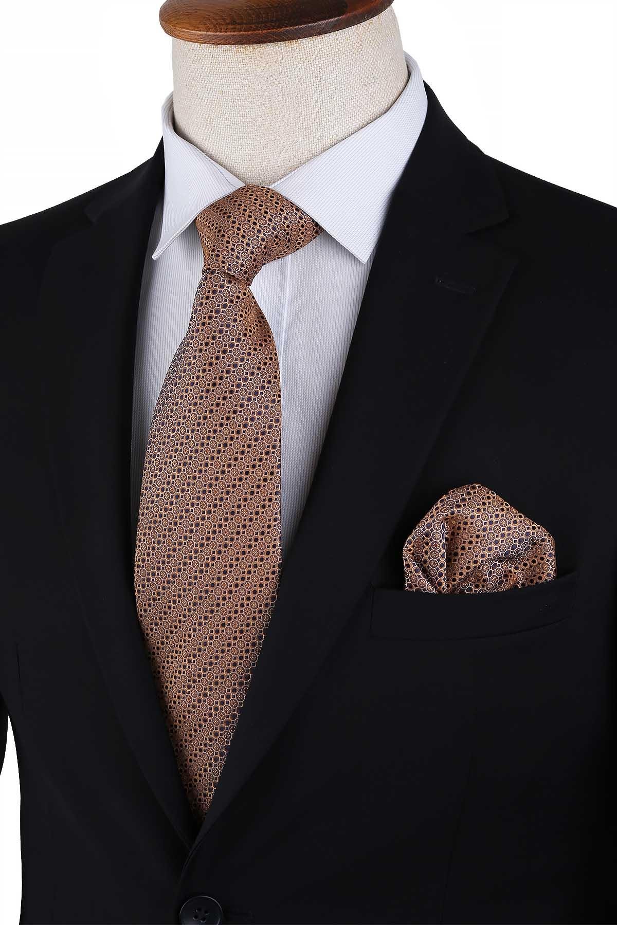 Sarı Küçük Desen Mendilli Klasik Kravat KK13140 (KK13140)