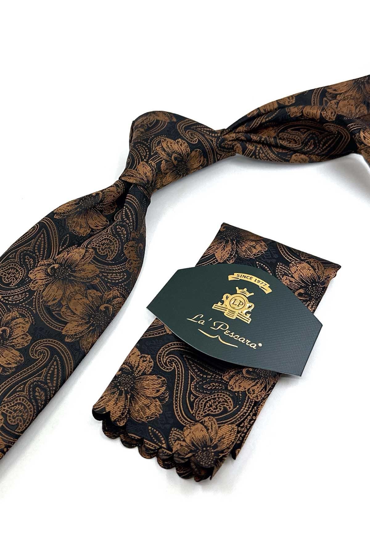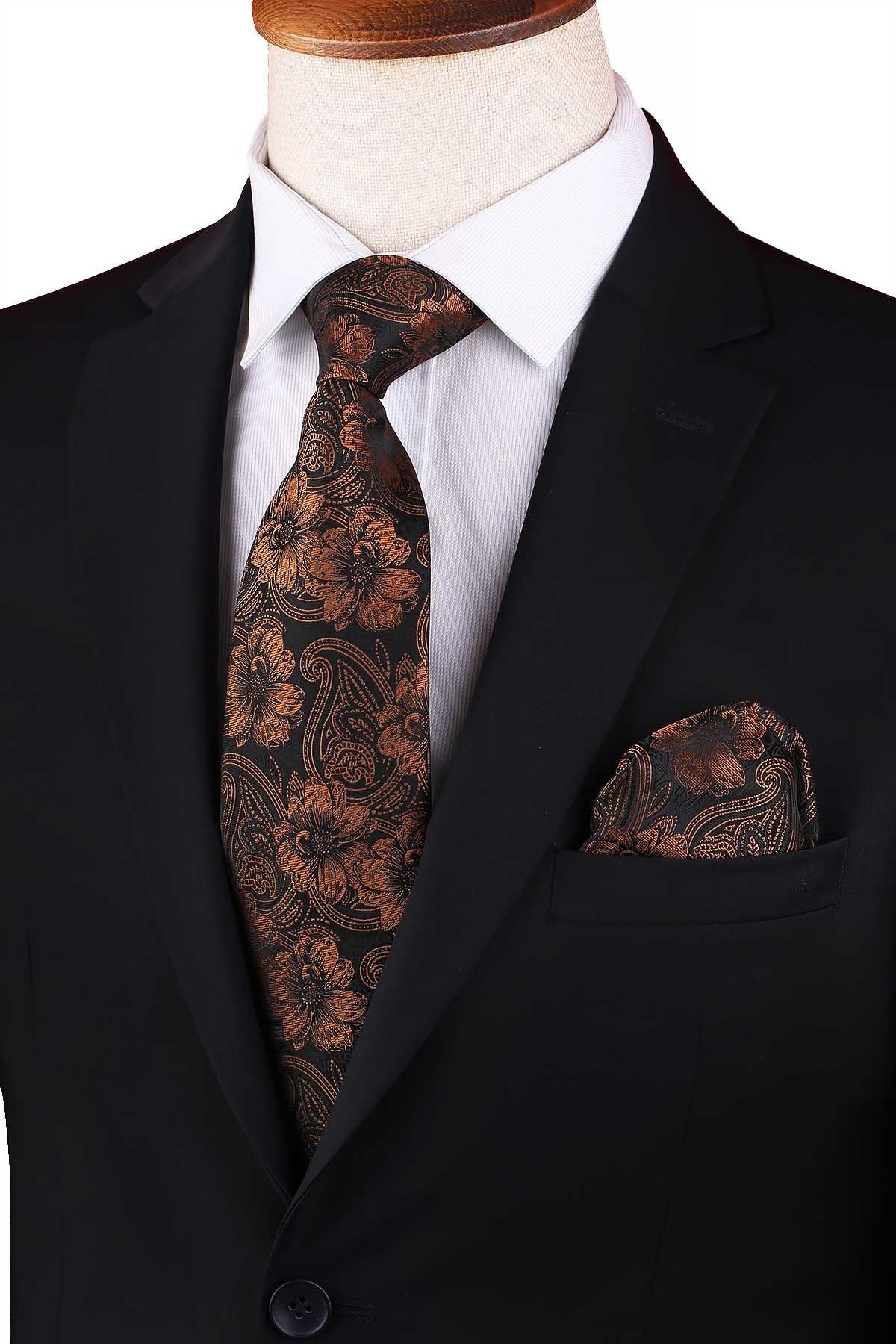 Siyah - Kahve Çiçek Desen Mendilli Klasik Kravat KK12947 (KK12947)