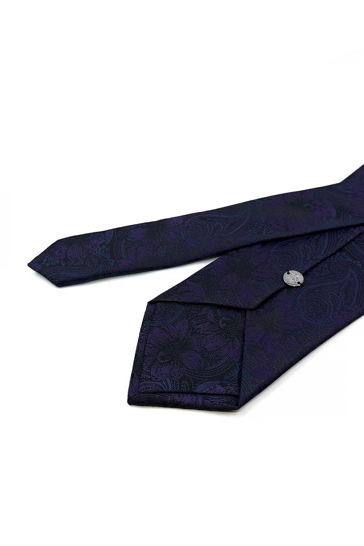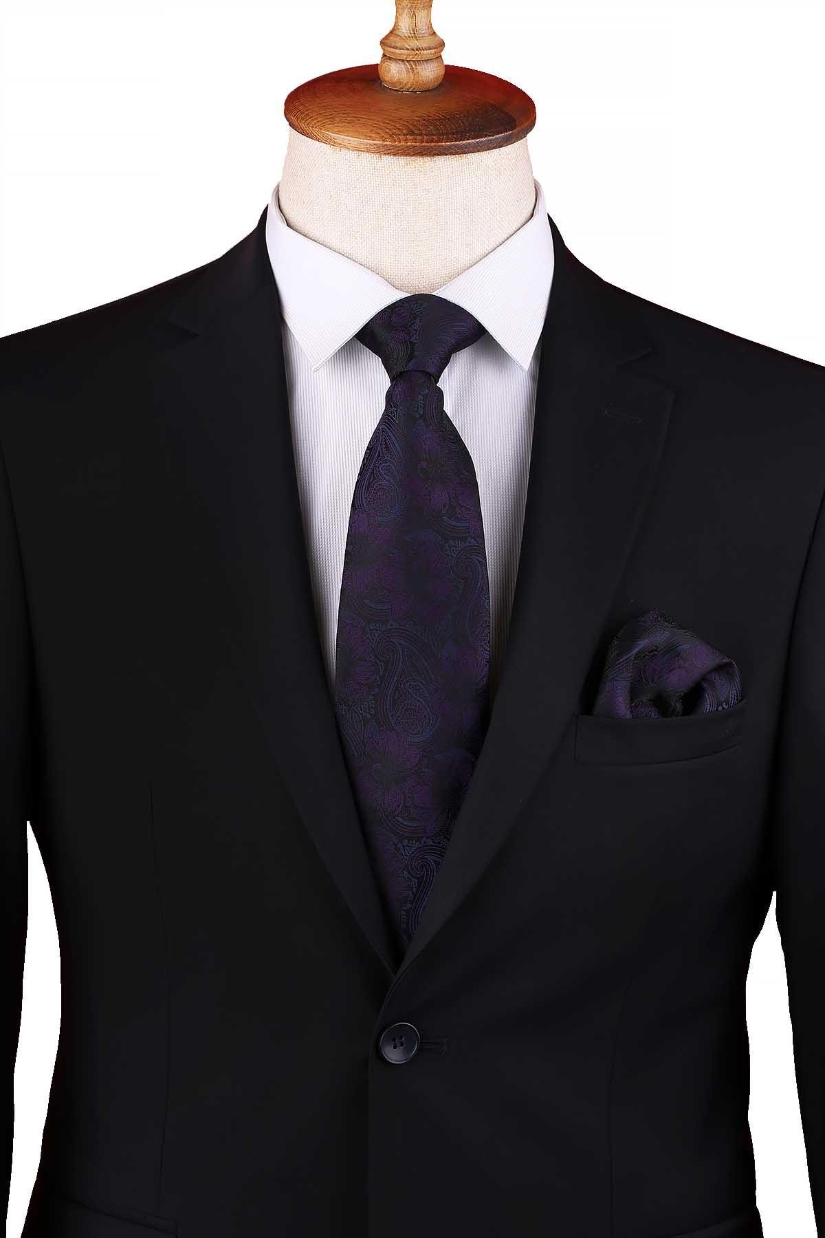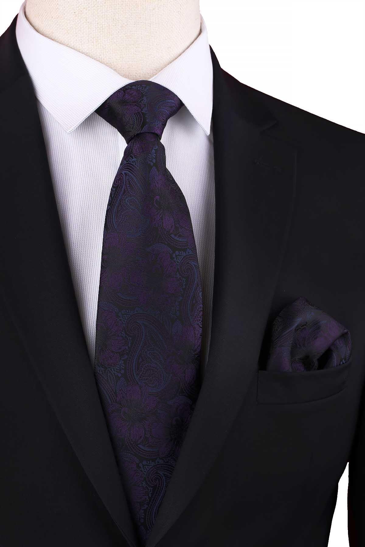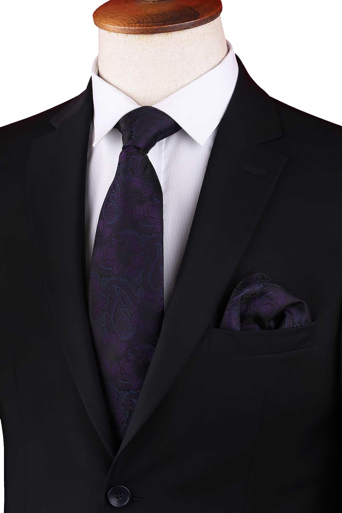 Siyah - Mürdüm Çiçek Desen Mendilli Klasik Kravat KK12948 (KK12948)