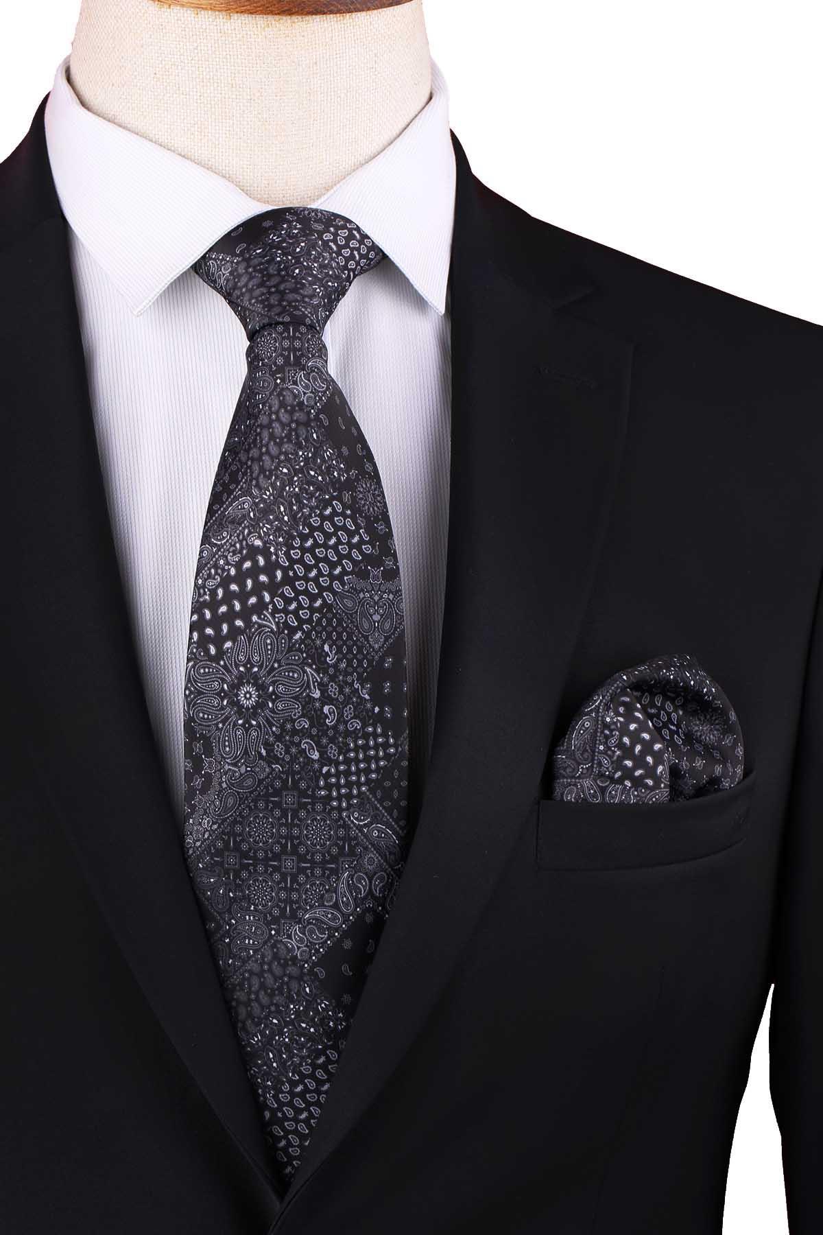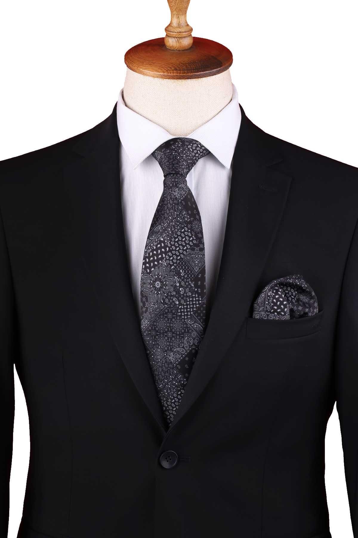 Siyah Patchwork Desen Baskılı Mendilli Klasik Kravat KK13350 (KK13350)