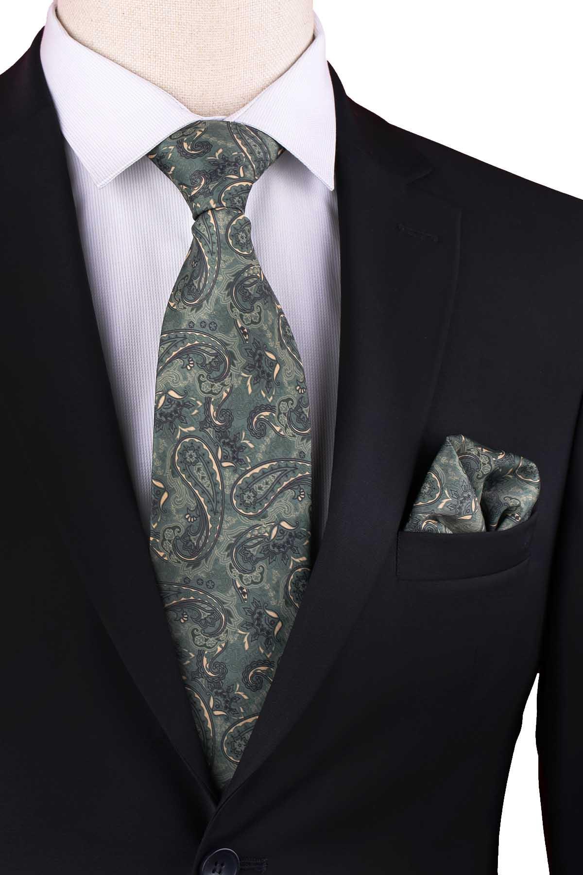 Yeşil Şal Desen Baskılı Mendilli Klasik Kravat KK13344 (KK13344)